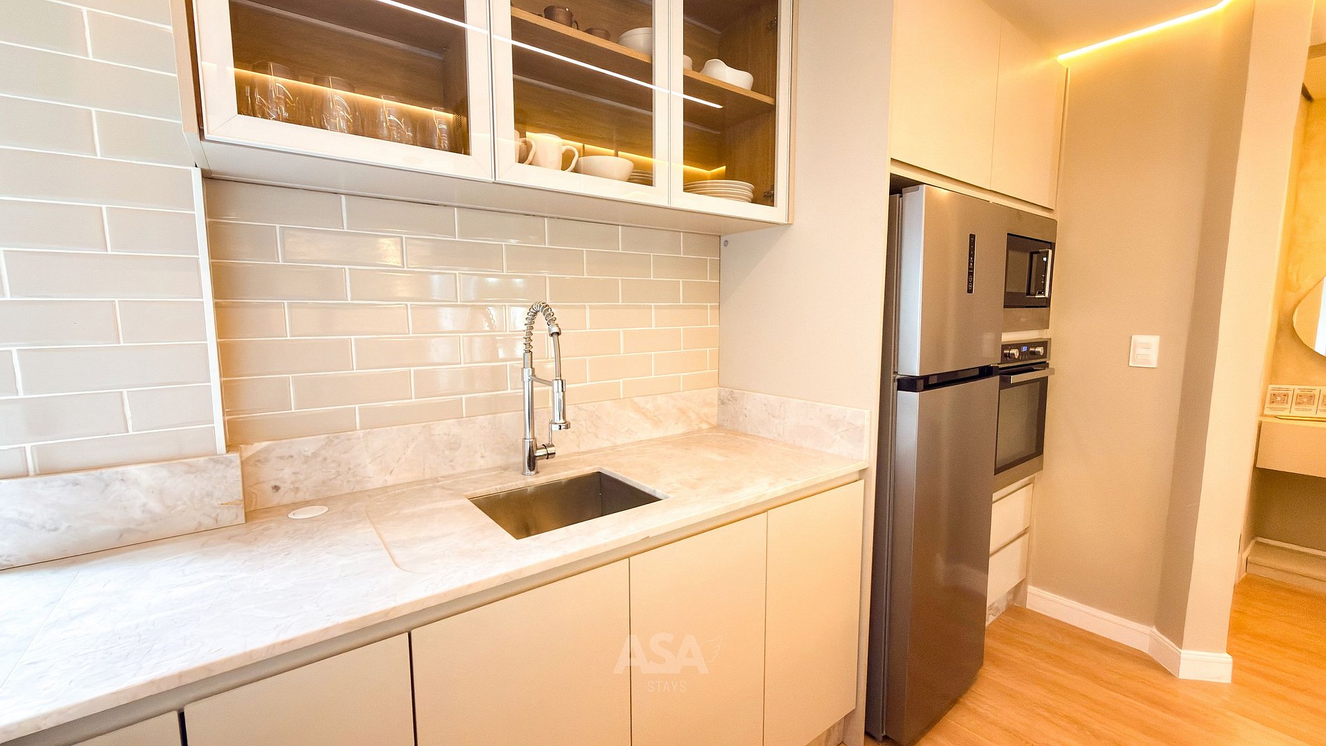 • Cozinha equipada com geladeira, freezer, fogão, forno, micro-ondas