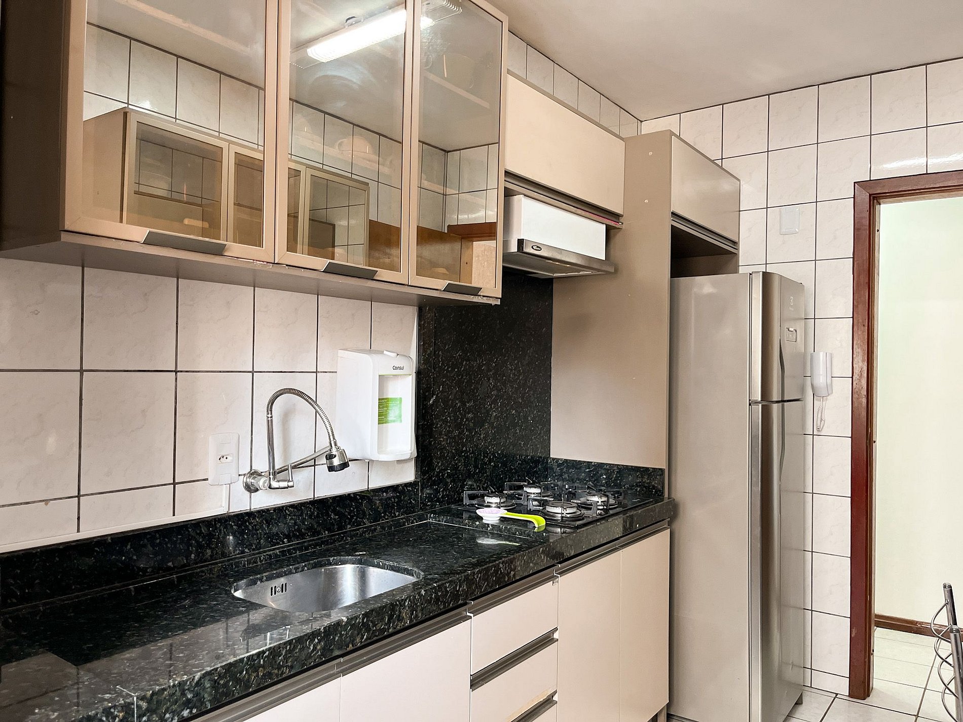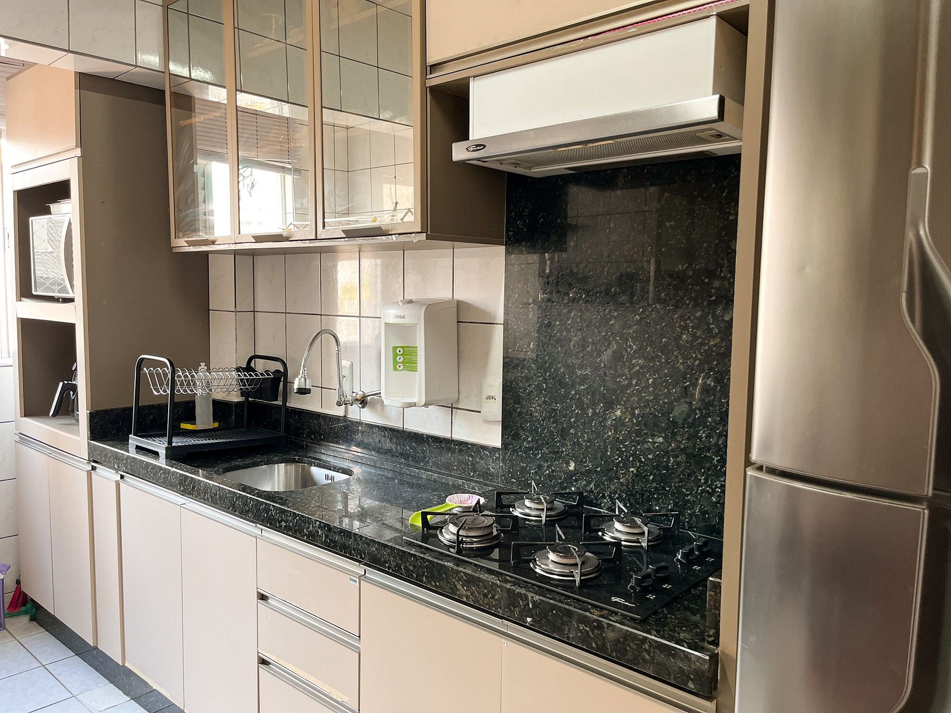 • Cozinha equipada com fogão, geladeira e utensílios básicos.