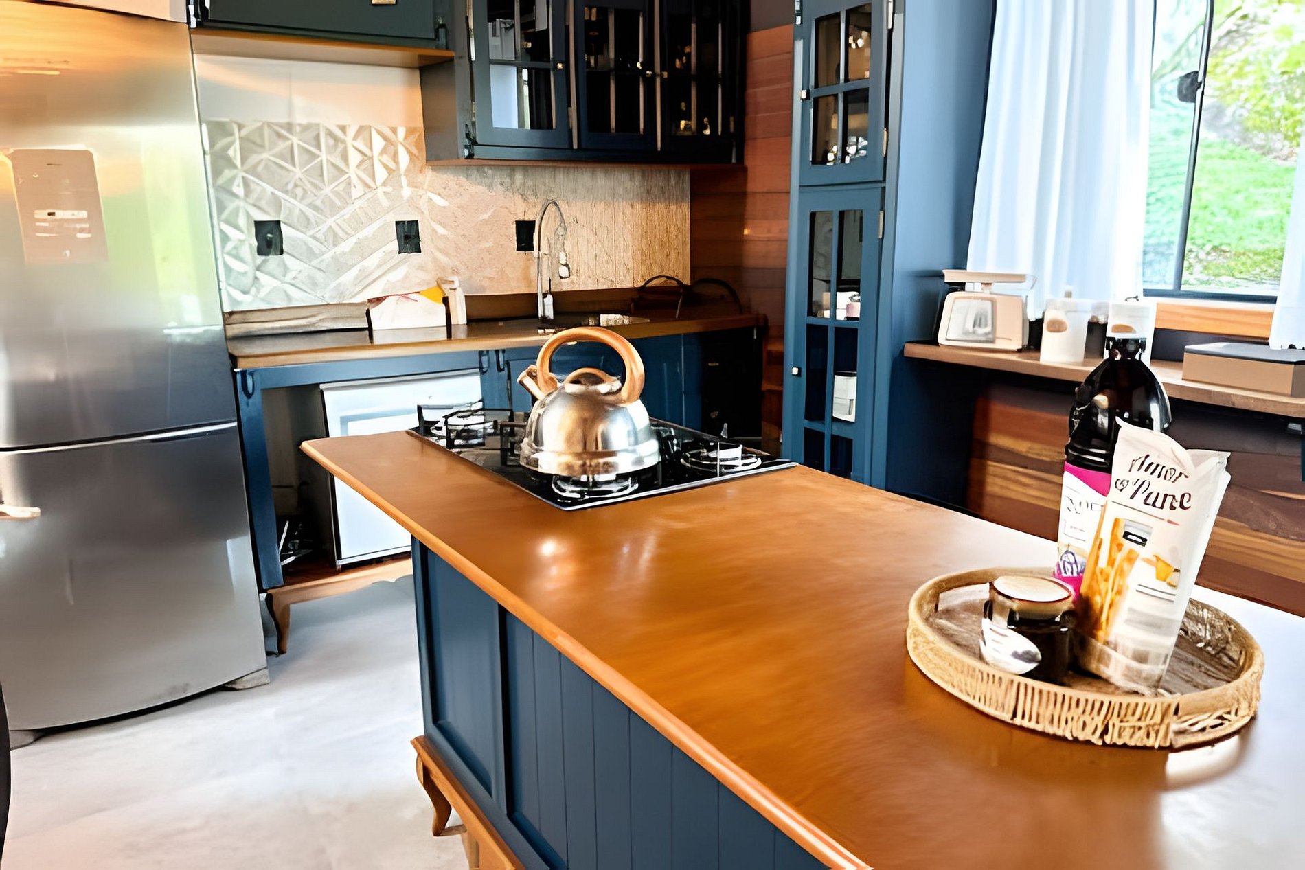 • Cozinha completa com geladeira, fogão, micro-ondas, lava-louças e cafeteira