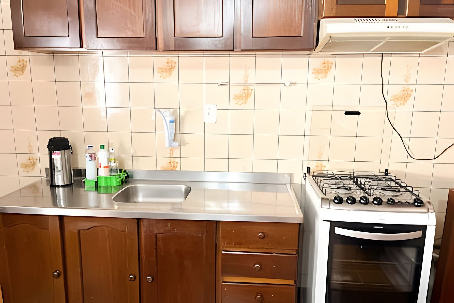 • Cozinha completa com fogão, geladeira, micro-ondas, utensílios e panelas