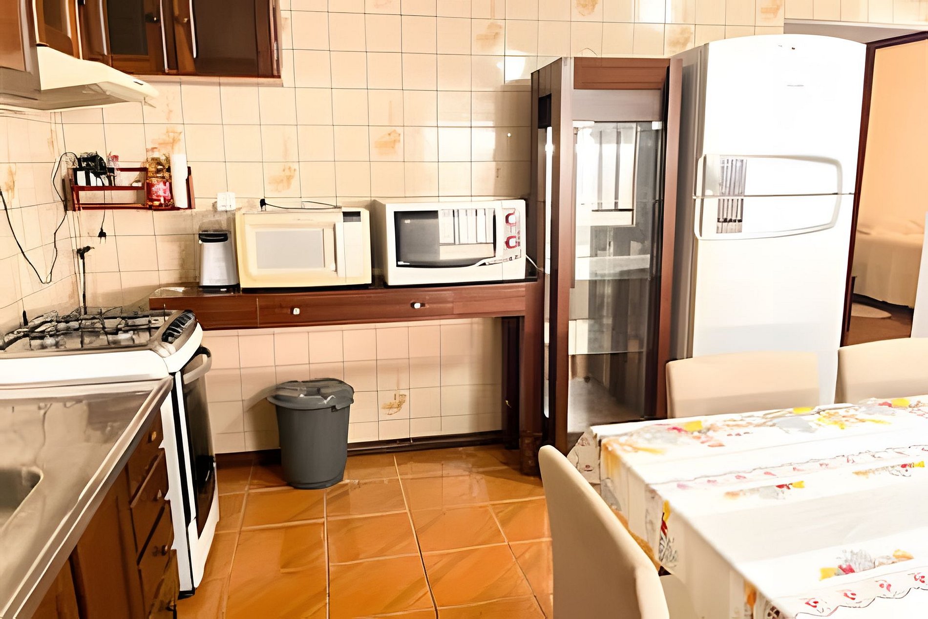 • Cozinha completa com fogão, geladeira, micro-ondas, utensílios e panelas