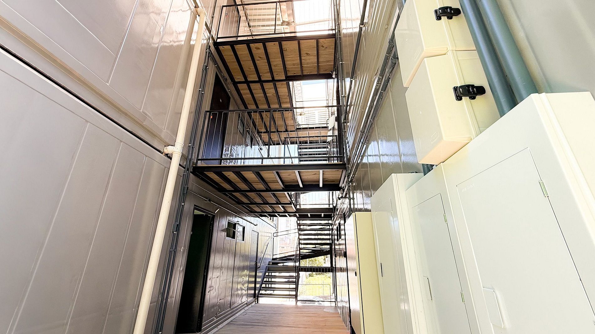 Cada container foi transformado em 2 studios totalmente equipados, proporcionando aos hóspedes a experiência única de se hospedar em um ambiente temático e contemporâneo, que valoriza o design industrial e a consciência ambiental.