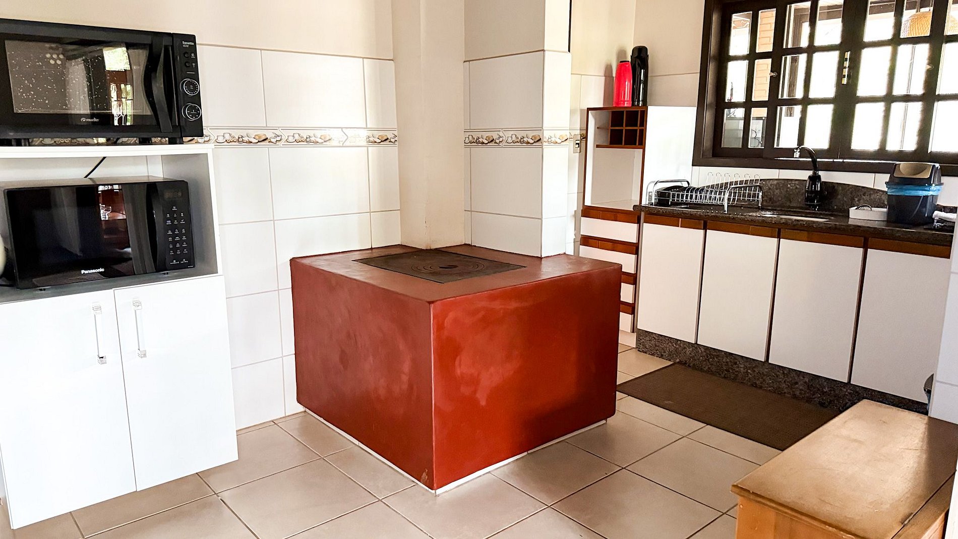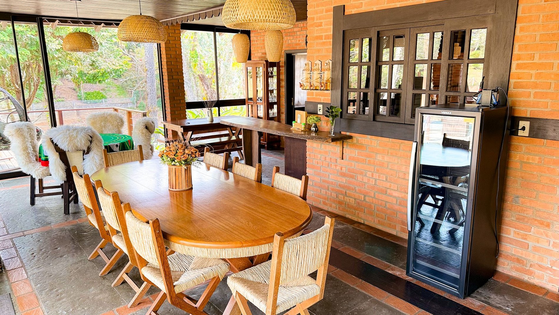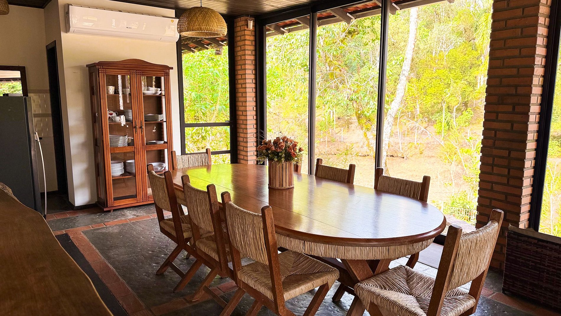 São 4 quartos climatizados (2 suítes + 2 quartos com banheiro compartilhado), todos com cama de casal e enxoval novo. A área de festas climatizada conta com churrasqueira a carvão, cervejeira, mesa para jogos e lavabo. No exterior, há um amplo terreno com playground infantil e deck com acesso direto à represa, além de uma vista panorâmica única.
