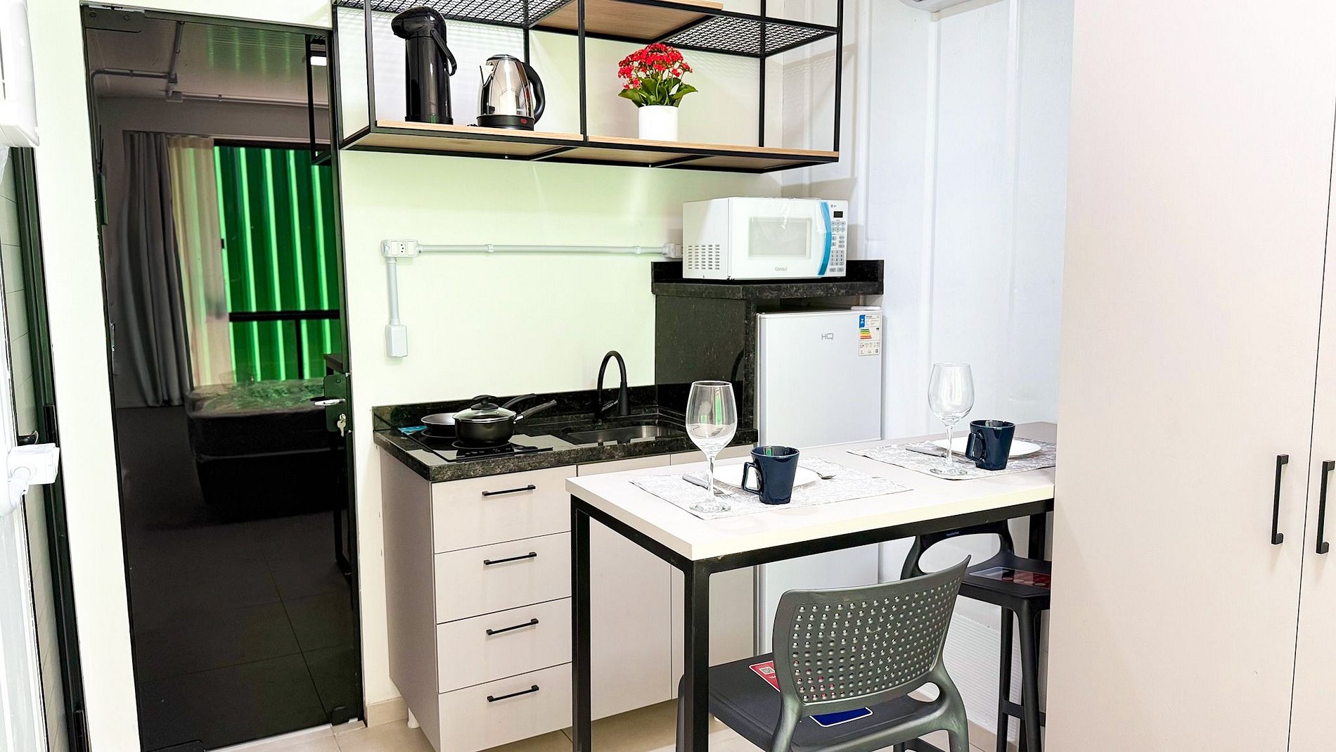 Cada studio é independente e equipado para oferecer total comodidade, com ambiente climatizado, cozinha compacta, banheiro privativo e vaga de estacionamento.