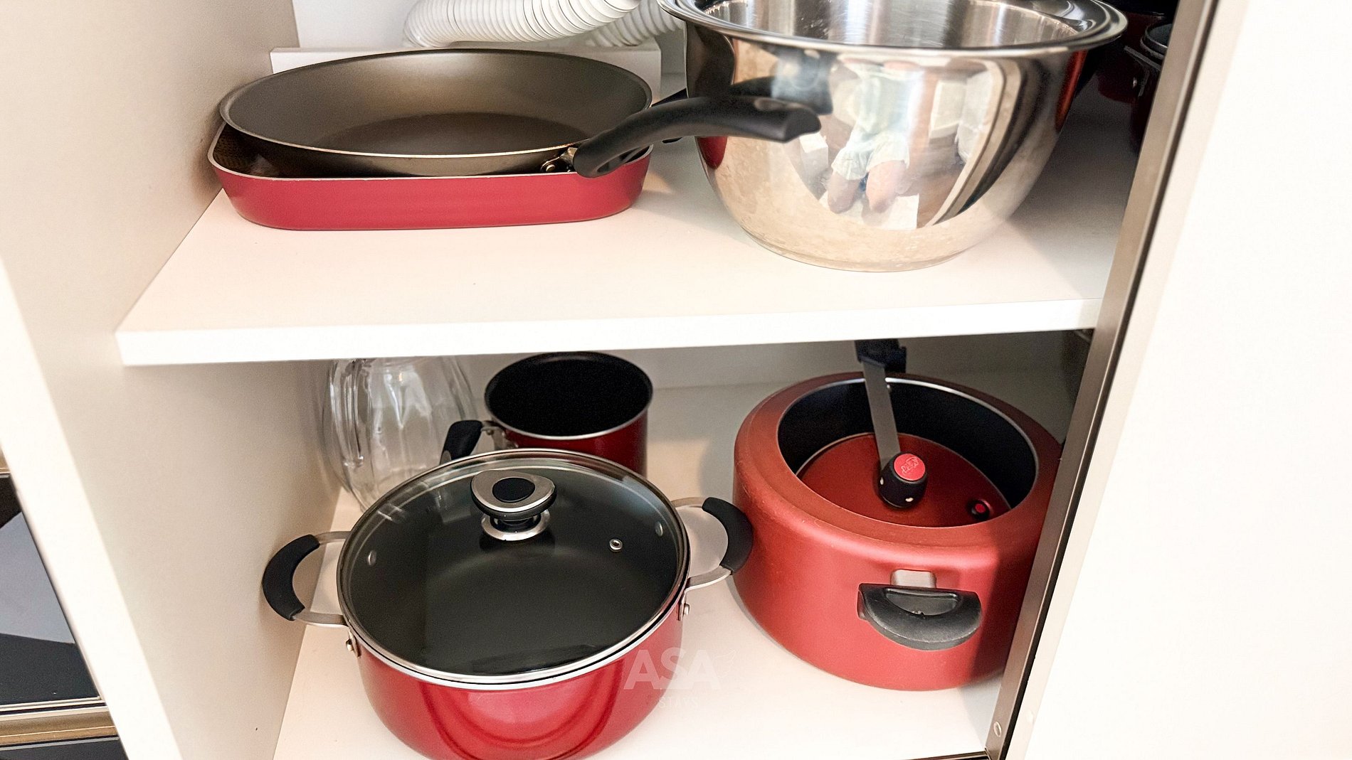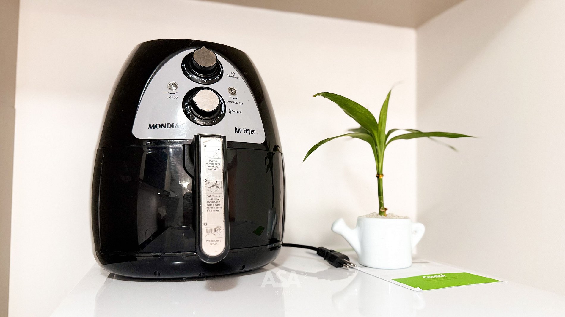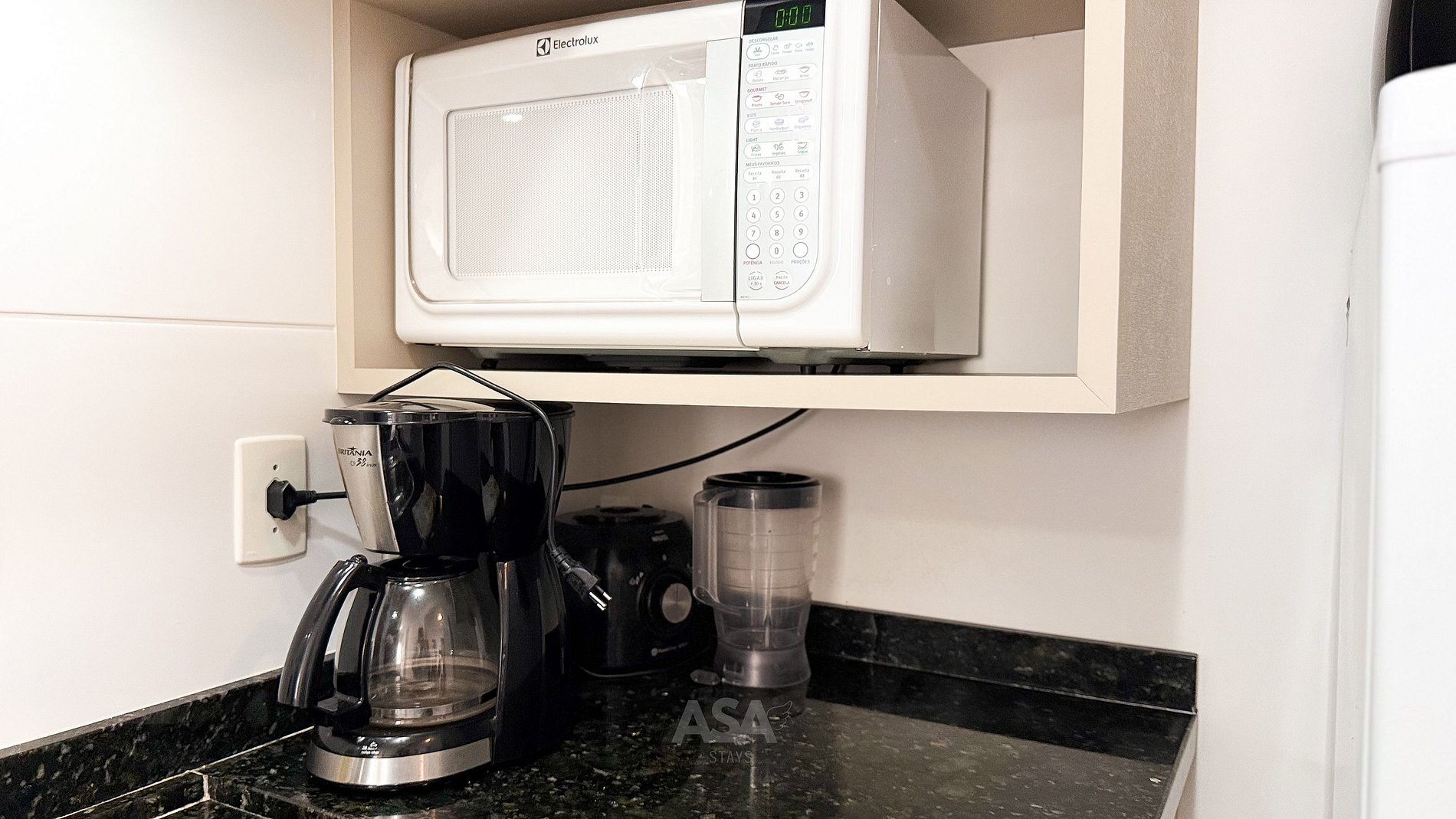 Geladeira, micro-ondas, airfryer, panela de pressão, chaleira elétrica, liquidificador, cafeteira.