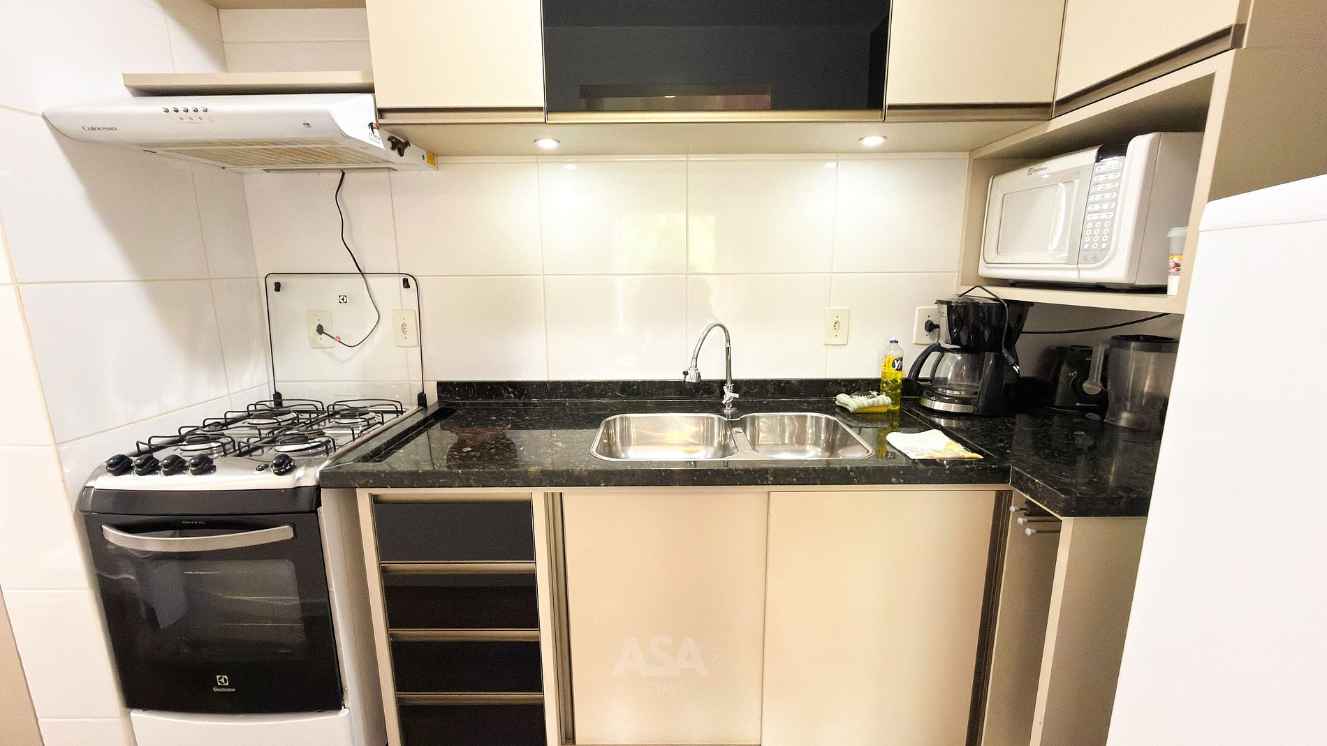 Cozinha equipada com fogão elétrico 4 bocas + forno