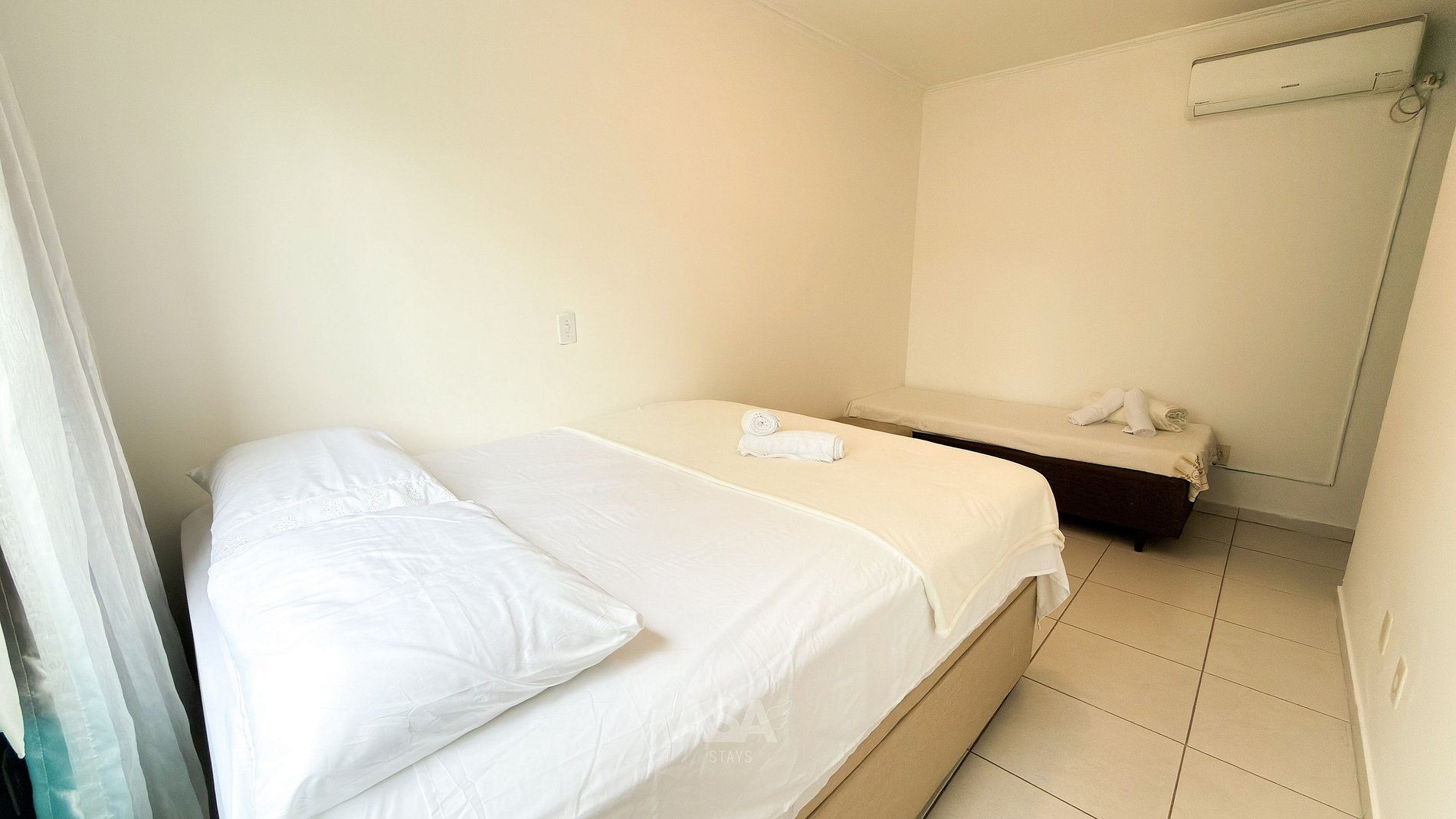 Quarto 1: cama de casal + cama de solteiro + ar-condicionado