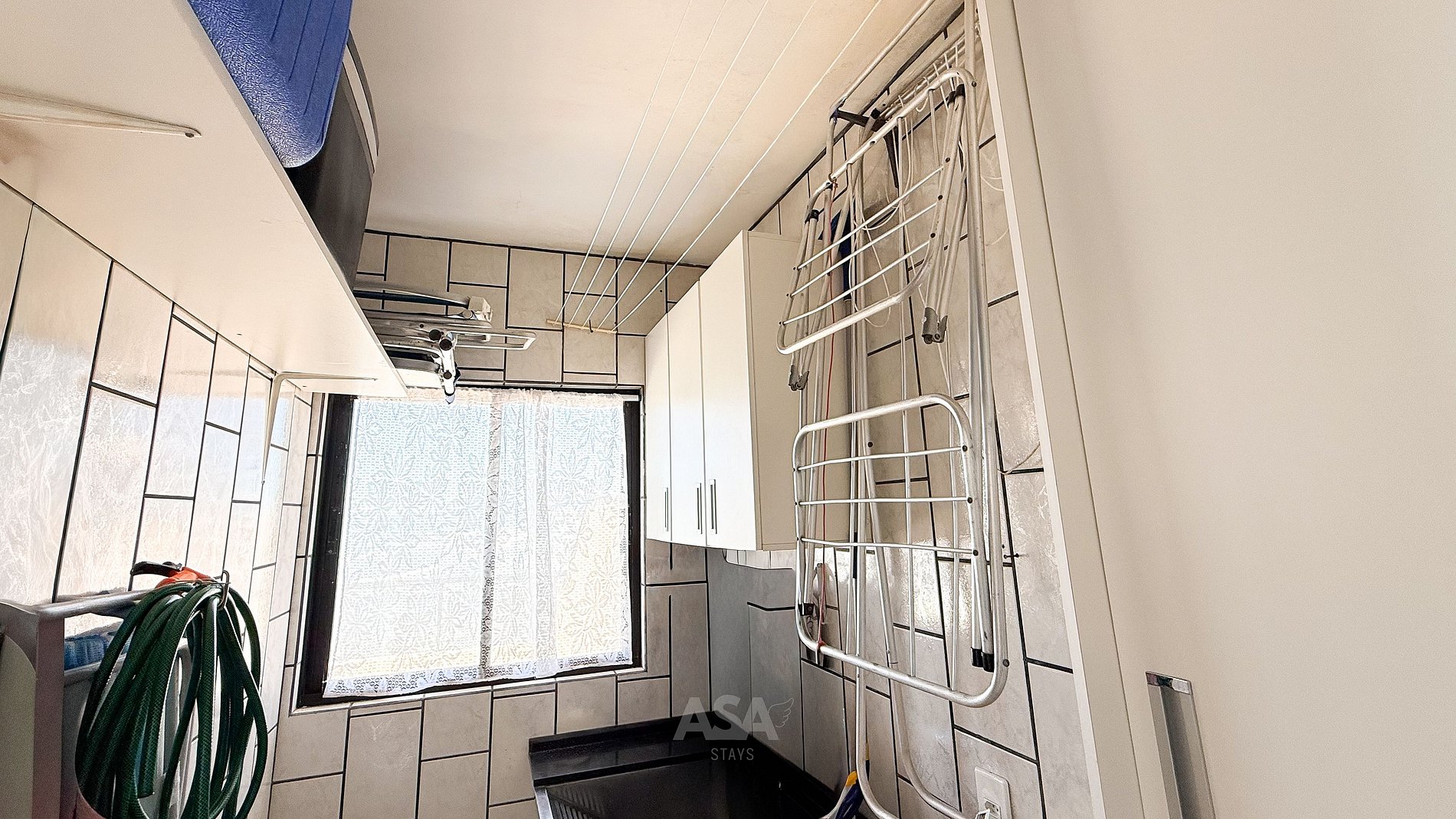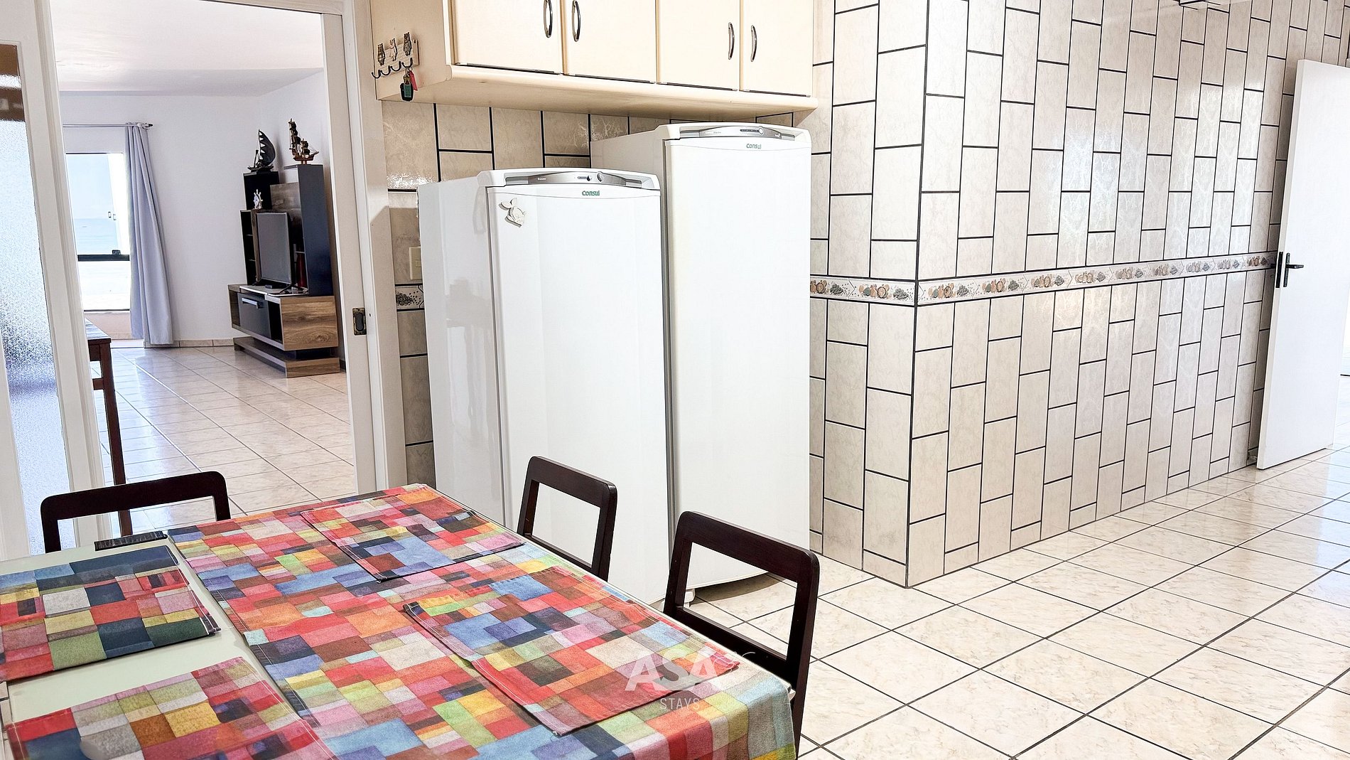 A cozinha é completa com fogão, forno, micro-ondas, freezer, geladeira, sanduicheira, batedeira, chaleira elétrica, cervejeira e utensílios para preparo de refeições. A varanda ou terraço amplo é ideal para confraternizar, com churrasqueira a carvão, mesa de jantar, itens para praia (cadeiras, guarda-sol) e lavanderia com máquina de lavar roupas + varal.