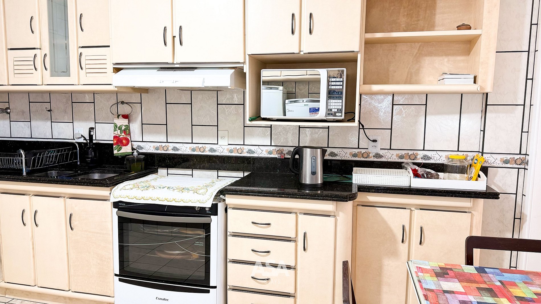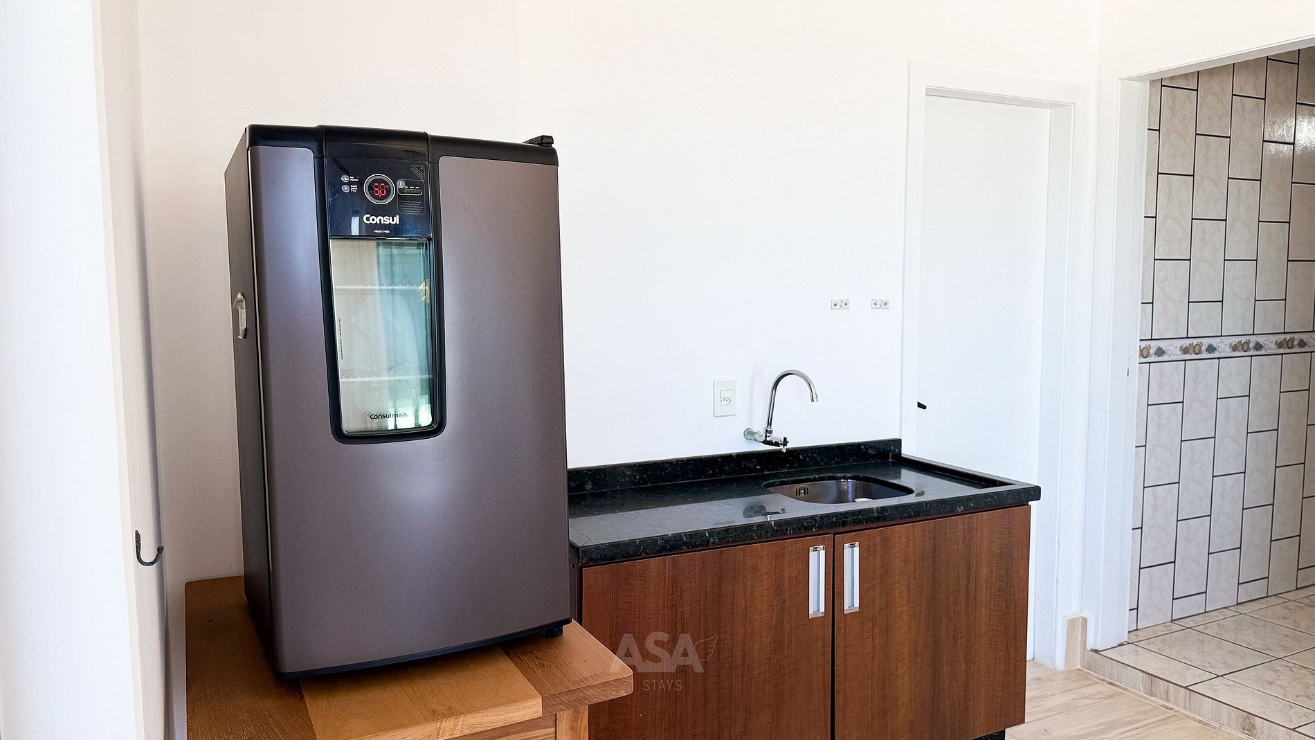Cozinha equipada com: fogão, forno, micro-ondas, freezer, geladeira