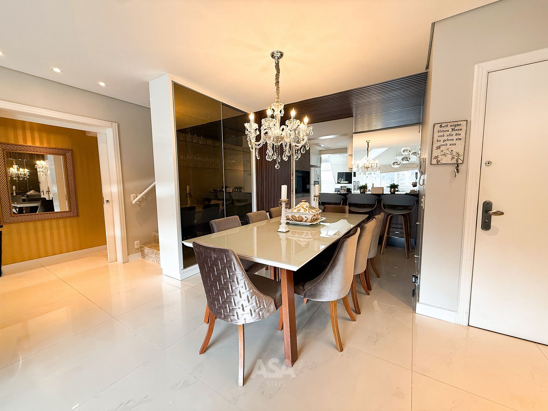 A cozinha é totalmente equipada com forno, fogão, geladeira, micro-ondas e utensílios e integrada a uma ampla sala de estar com Smart TV e mesa de jantar para 8 pessoas, além de 3 banquetas extras.
