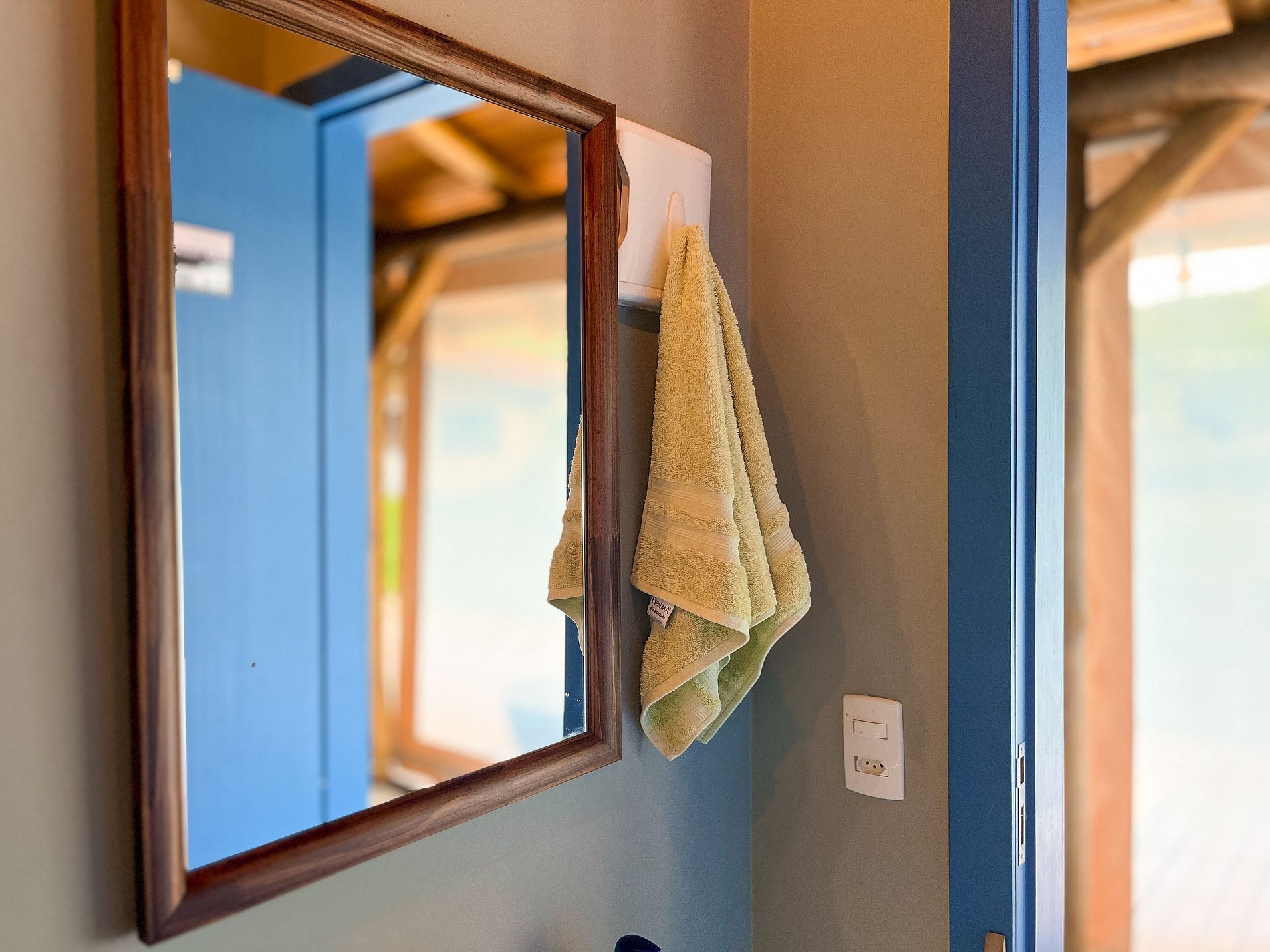 O chalé oferece uma experiência única de integração com a natureza, com amplas janelas de vidro que permitem vistas deslumbrantes das montanhas e da vegetação ao redor. O design moderno e acolhedor proporciona conforto e estilo, com uma estrutura elevada que garante privacidade e tranquilidade.