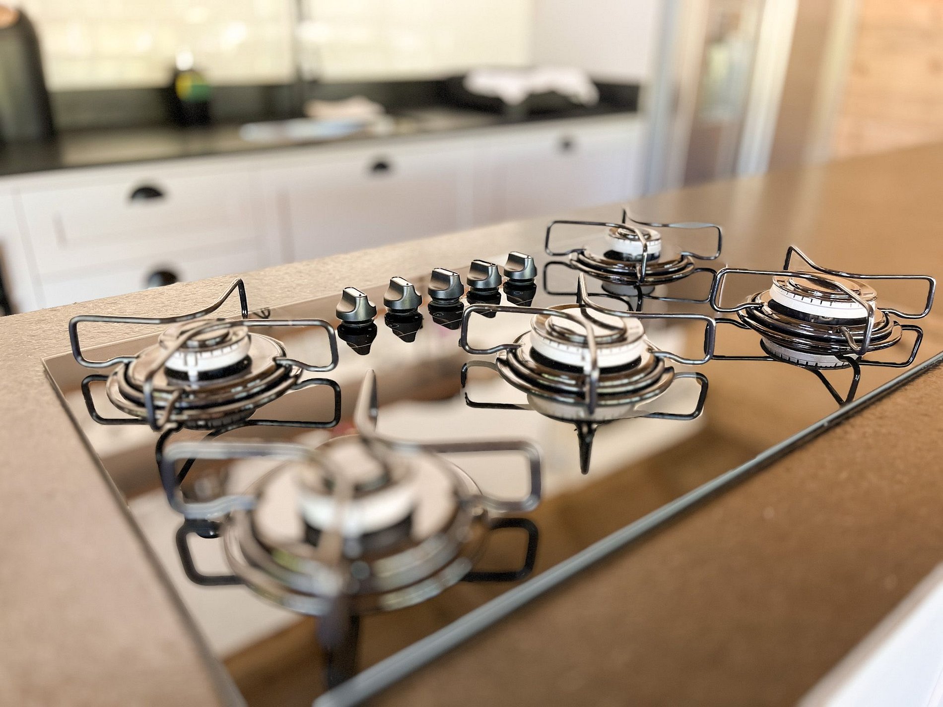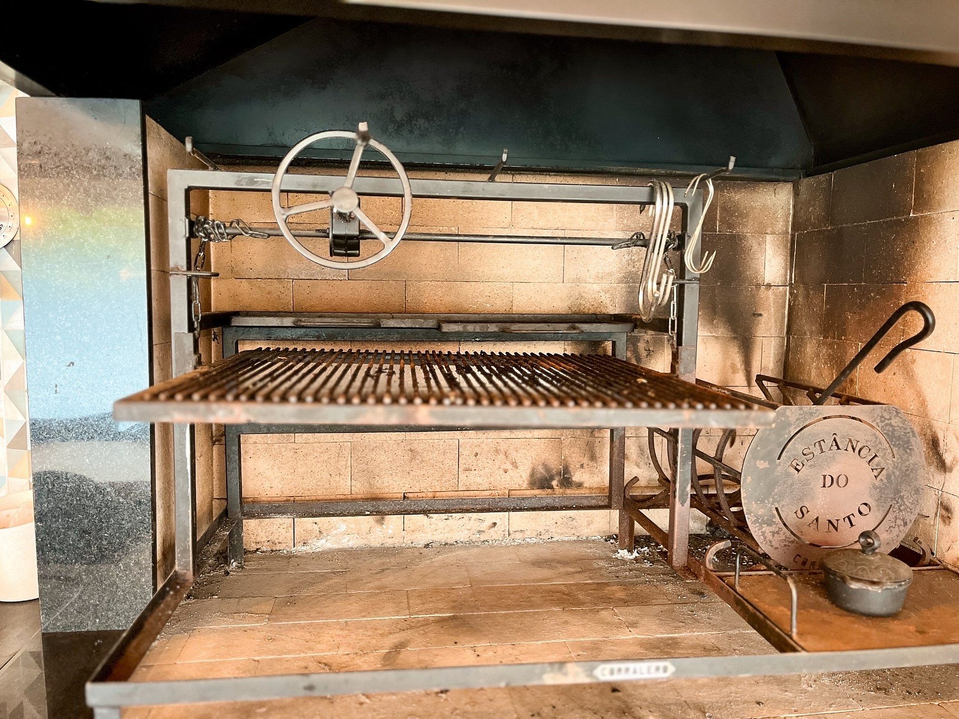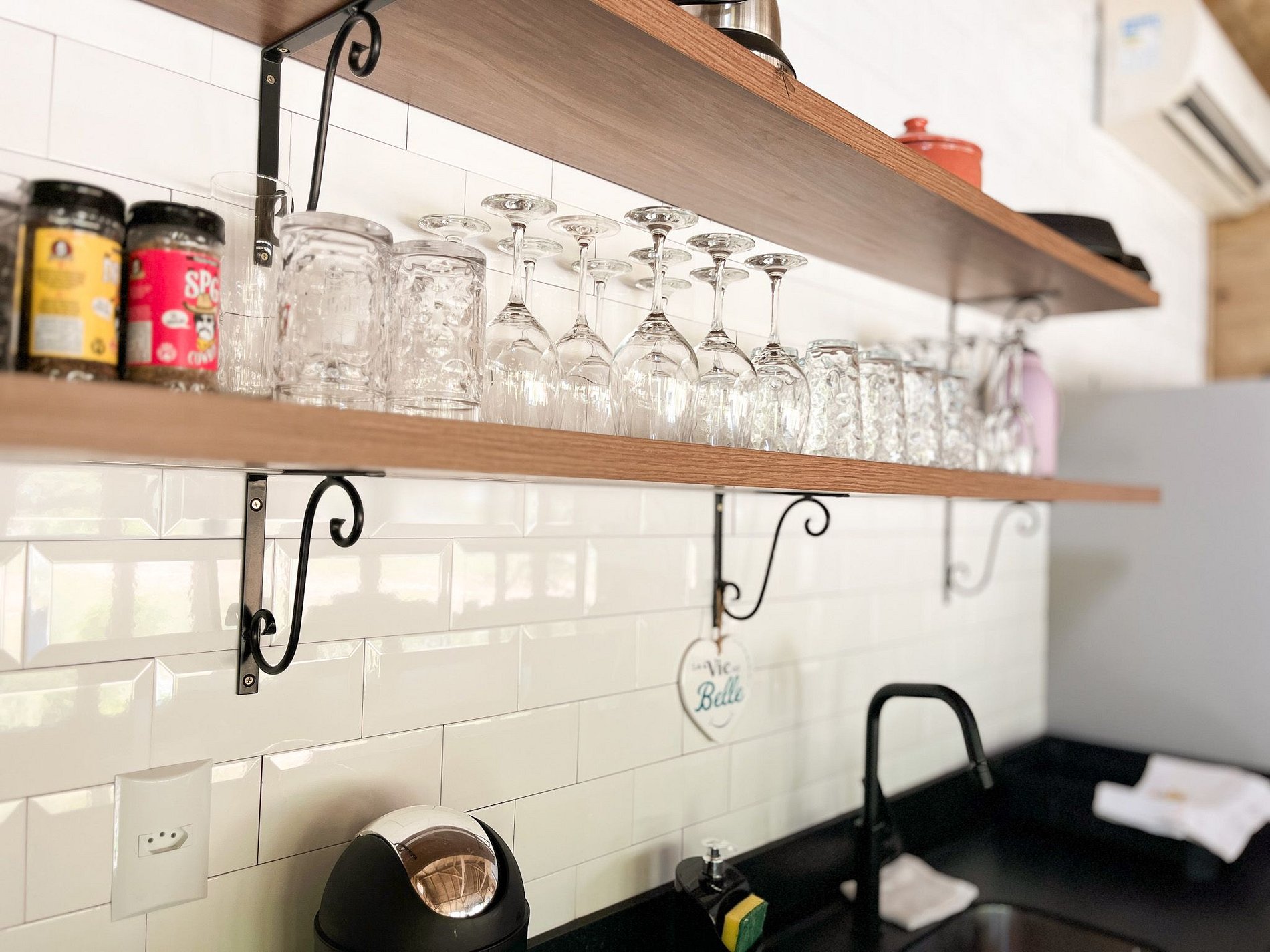 A cozinha está totalmente equipada com utensílios, eletrodomésticos e uma churrasqueira, perfeita para refeições caseiras.