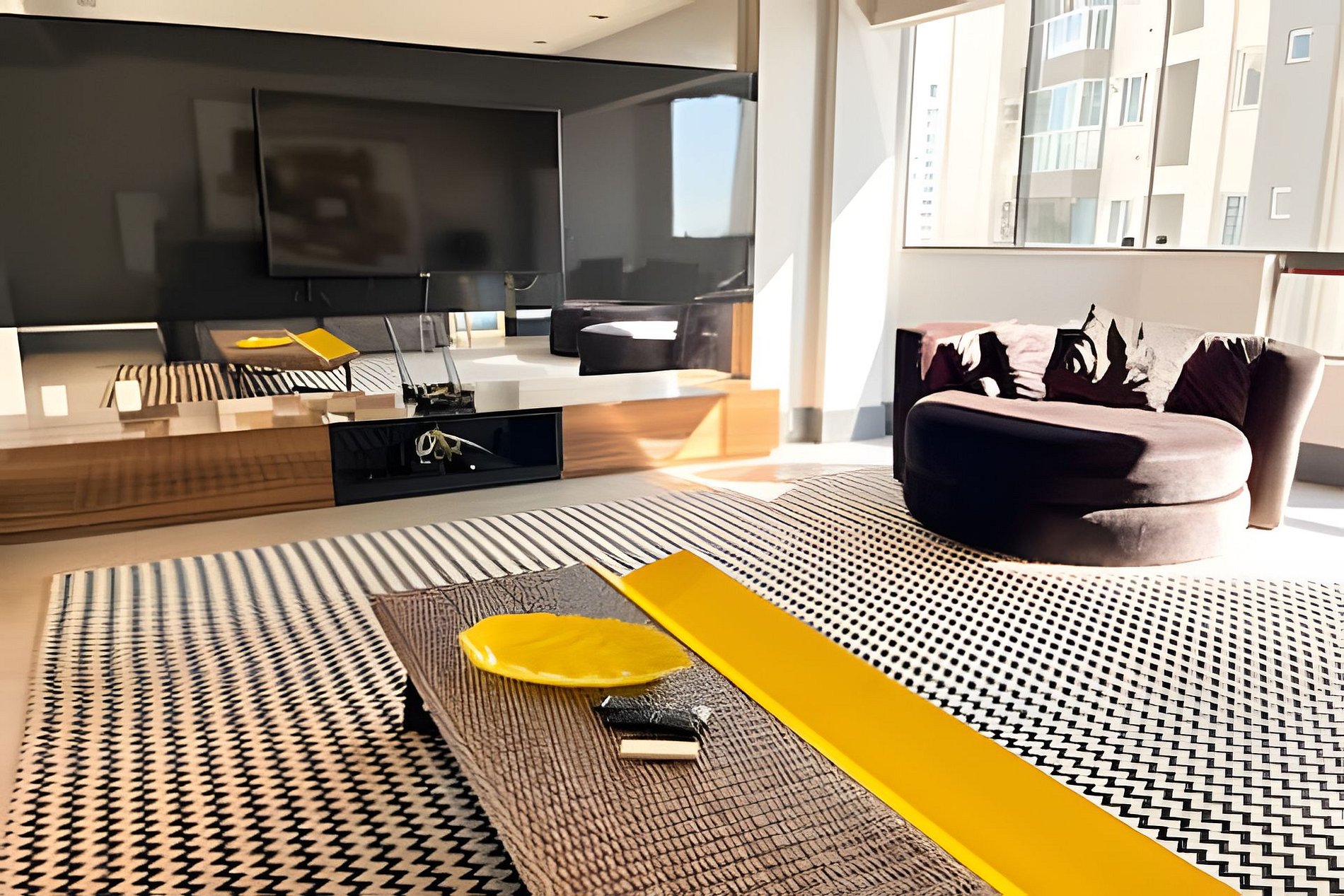 Ambientes amplos, integrados e climatizados Ar-condicionado em todos os cômodos Sala de estar com design sofisticado e TV Smart