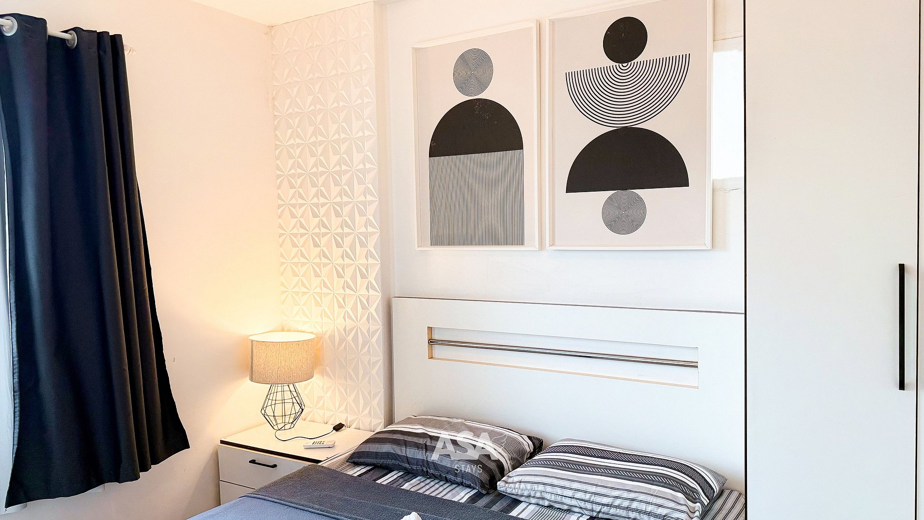 • 1 quarto com cama queen e ar-condicionado • Sofá-cama preparado sob demanda • Roupas de cama e toalhas fornecidas