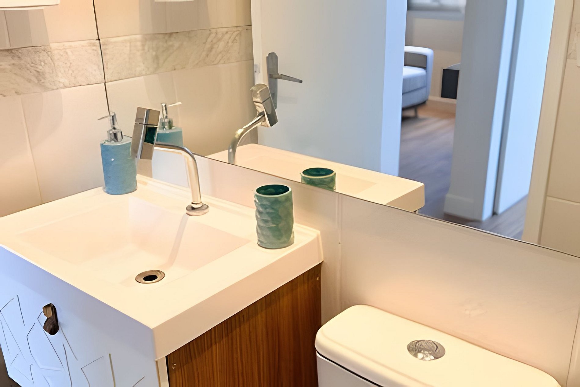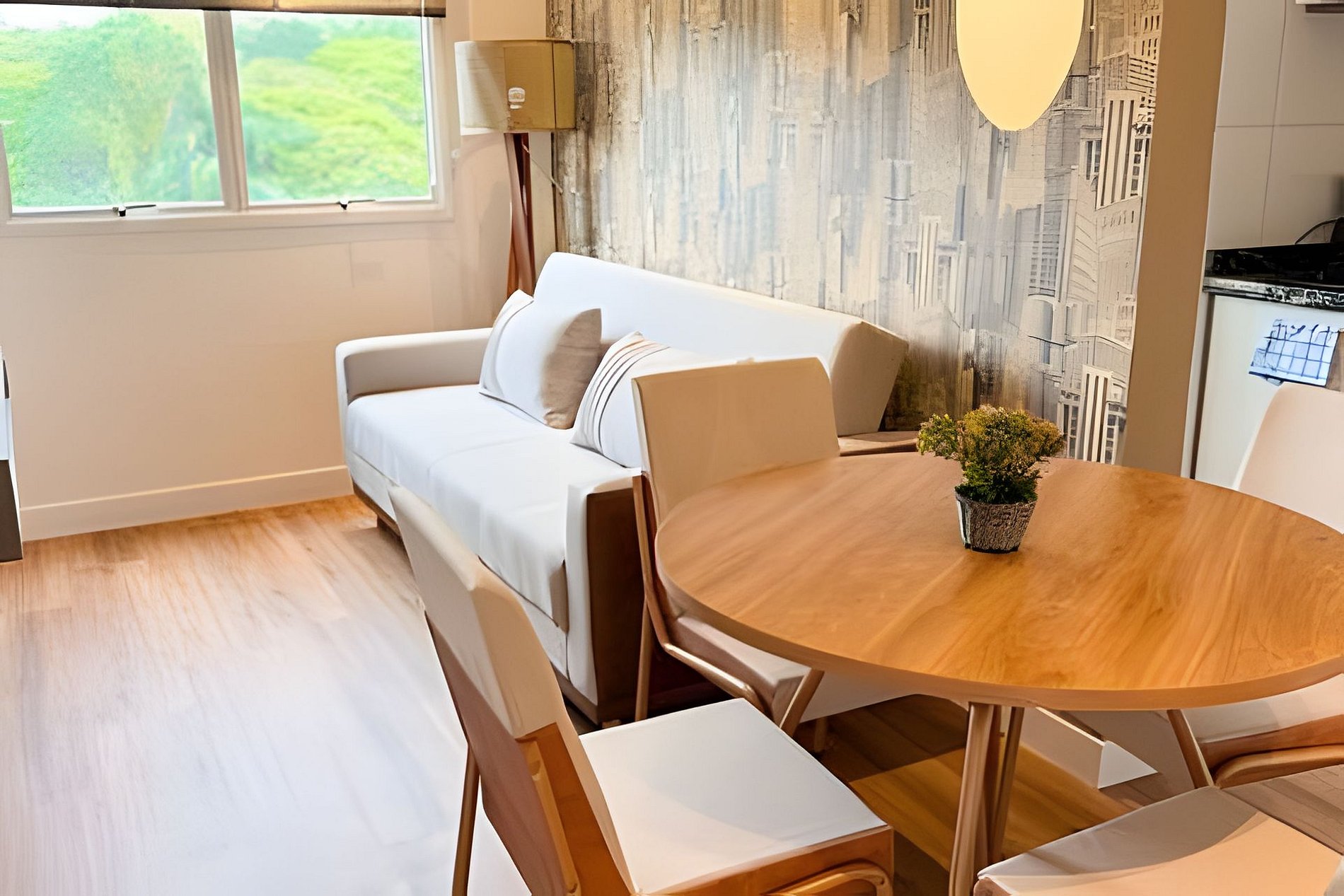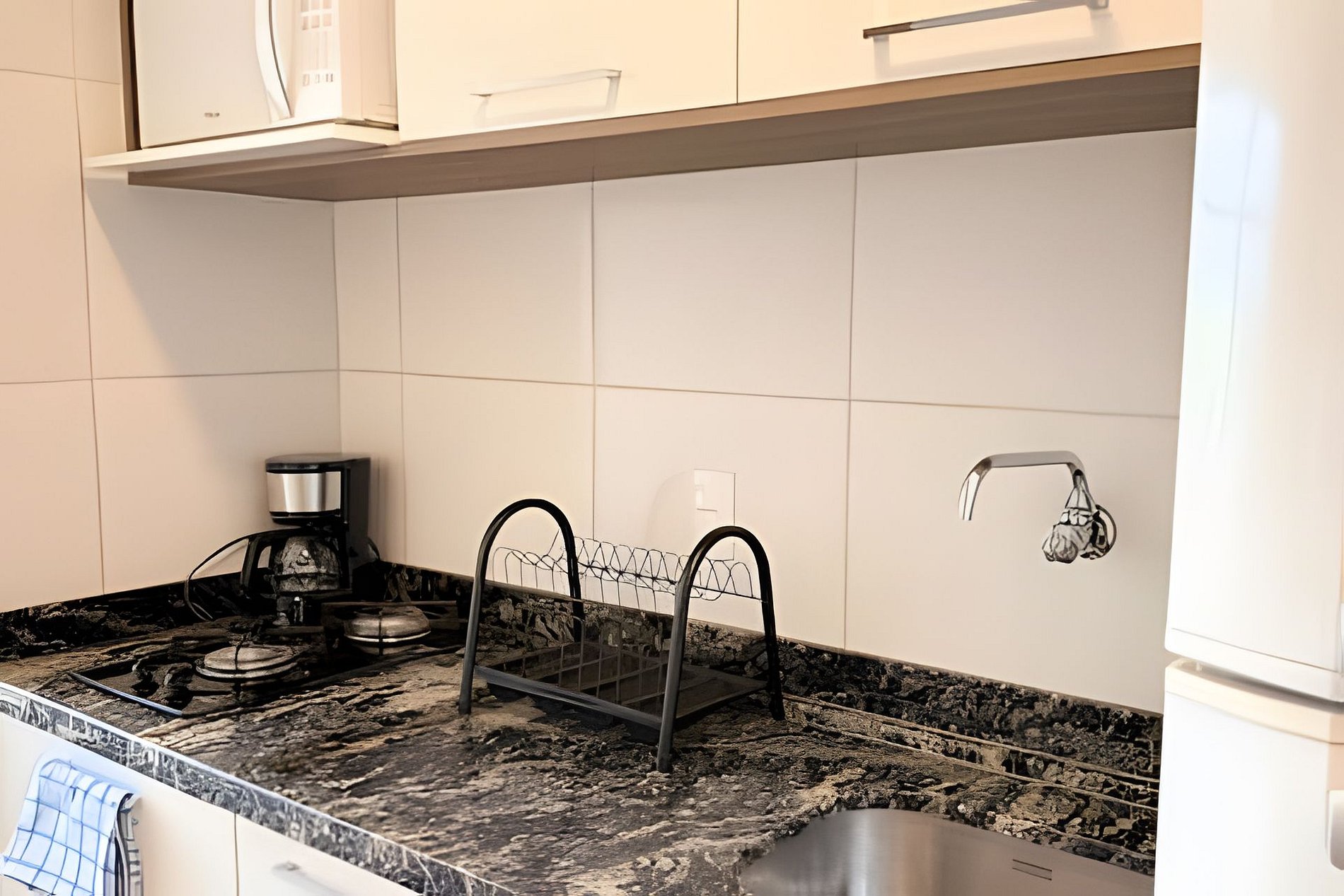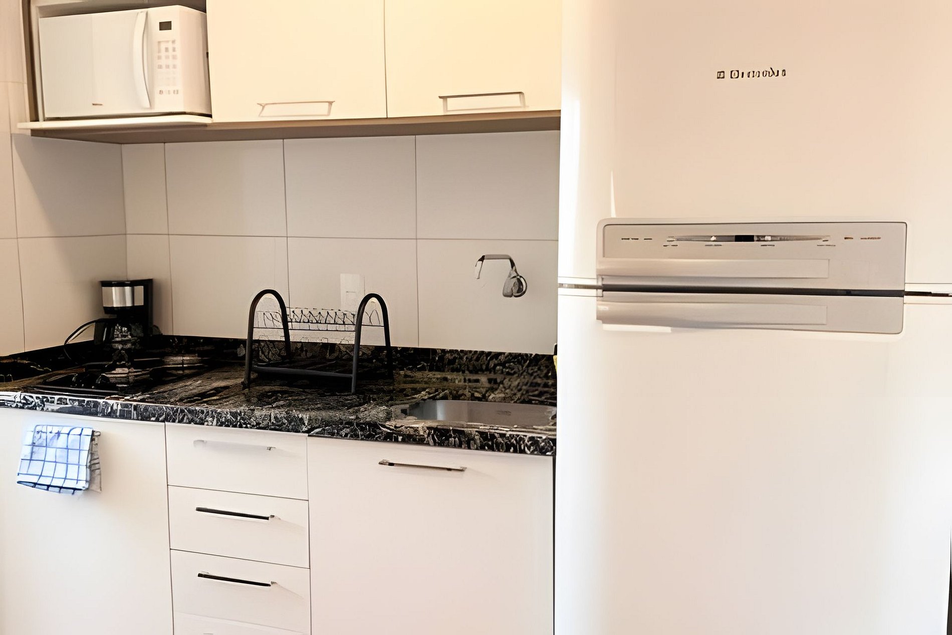 • Totalmente equipada com: Geladeira, Fogão, Micro-ondas, Utensílios completos, Máquina de lavar